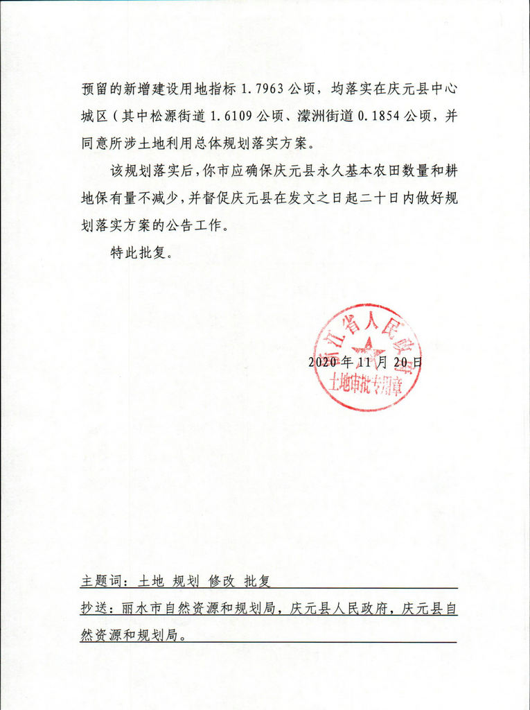 浙江省人民政府關于《慶元縣中心城區土地利用總體規劃(2011-2020年)》2020年第1次規劃落實方案的批復