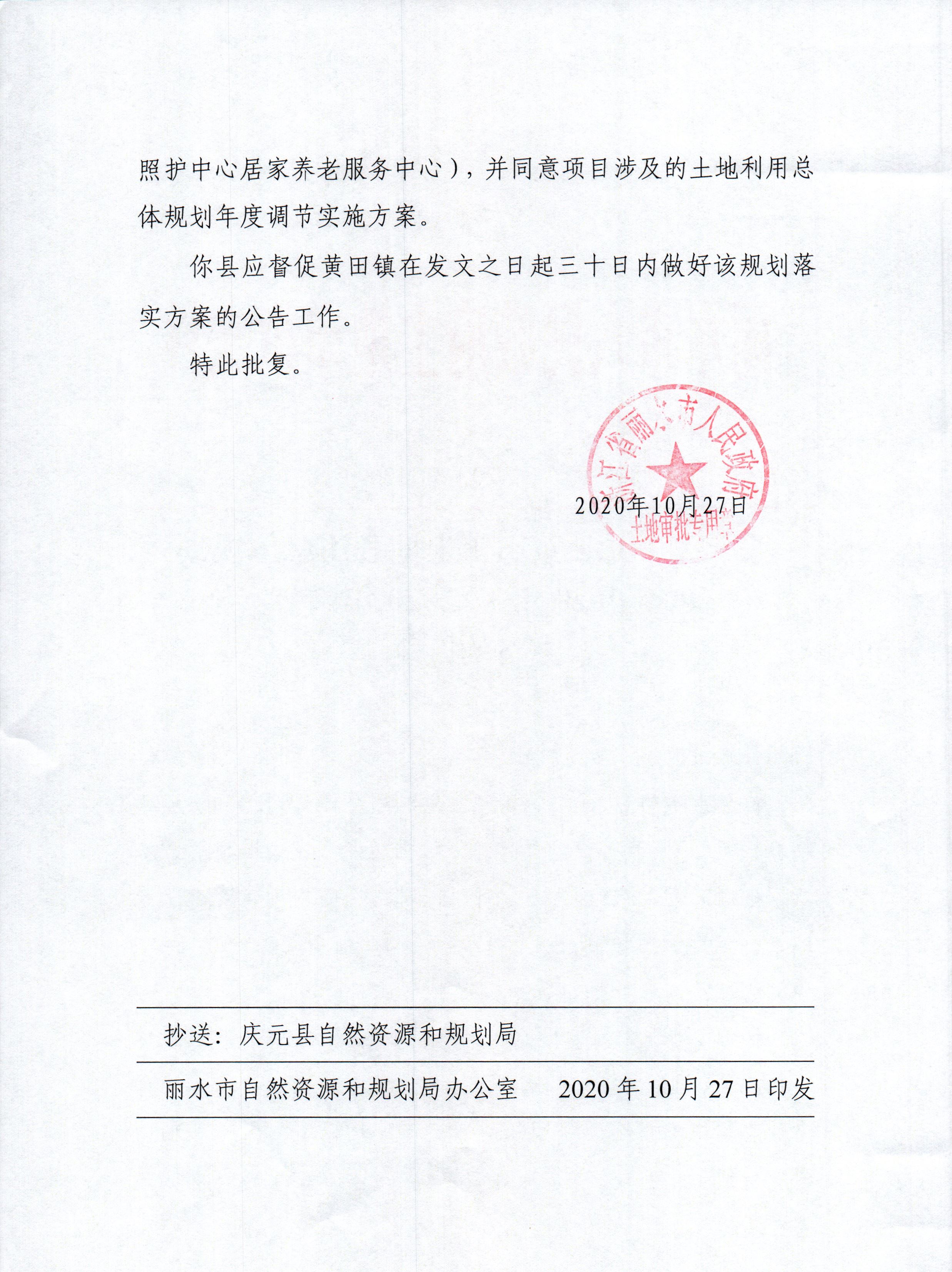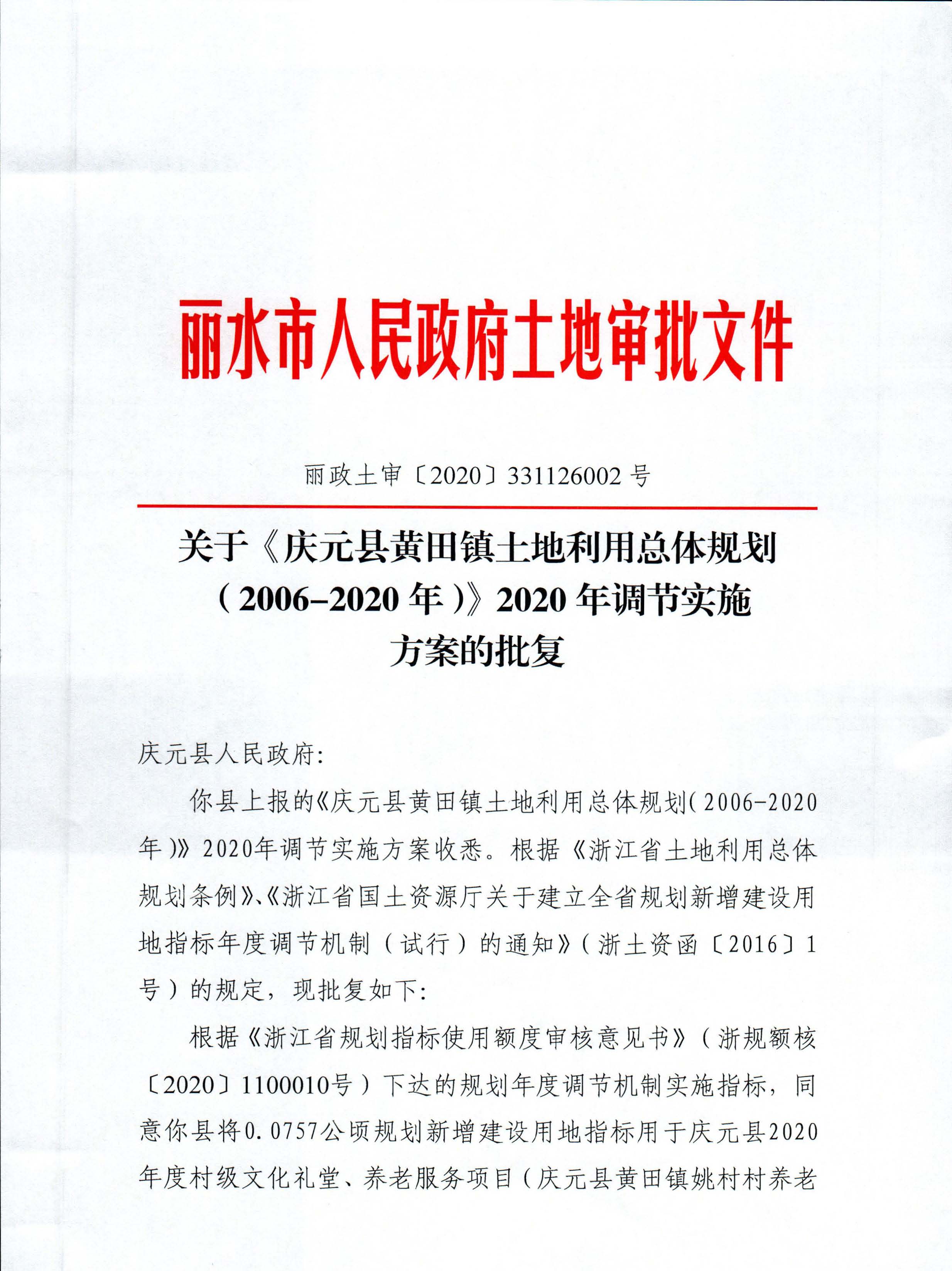 麗水市人民政府關(guān)于《慶元縣黃田鎮(zhèn)土地利用總體規(guī)劃(2006-2020年)》2020年調(diào)節(jié)實(shí)施方案的批復(fù)