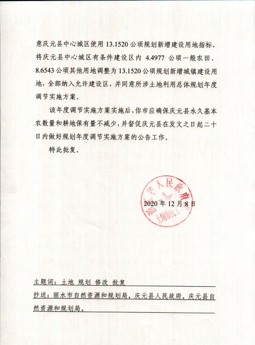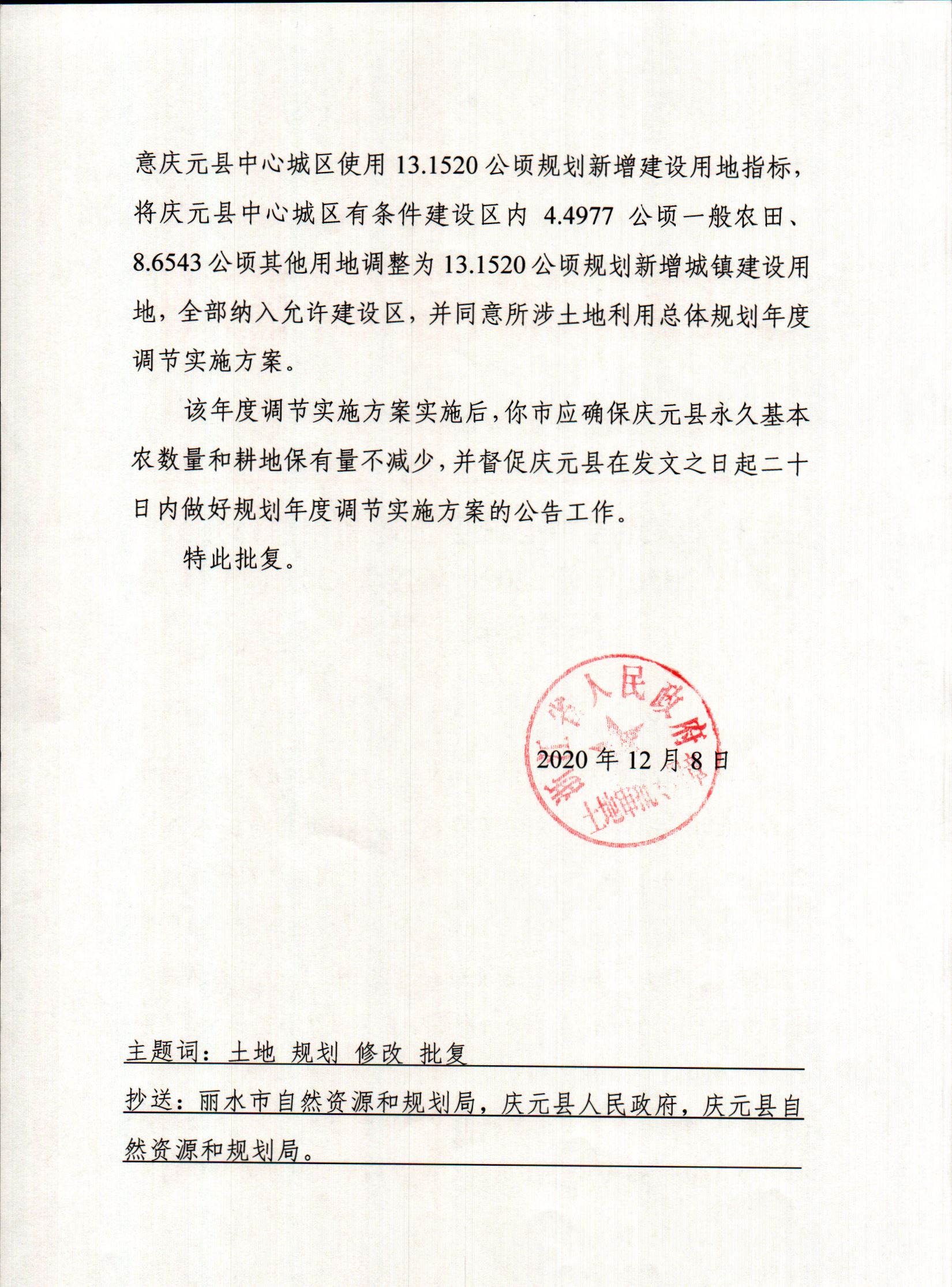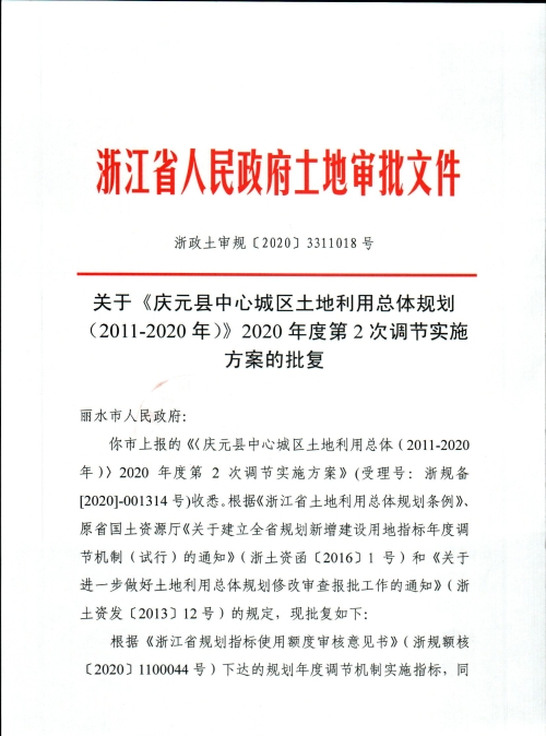 浙江省人民政府關于《慶元縣中心城區土地利用總體規劃(2011-2020年)》2020年度第2次調節實施方案的批復