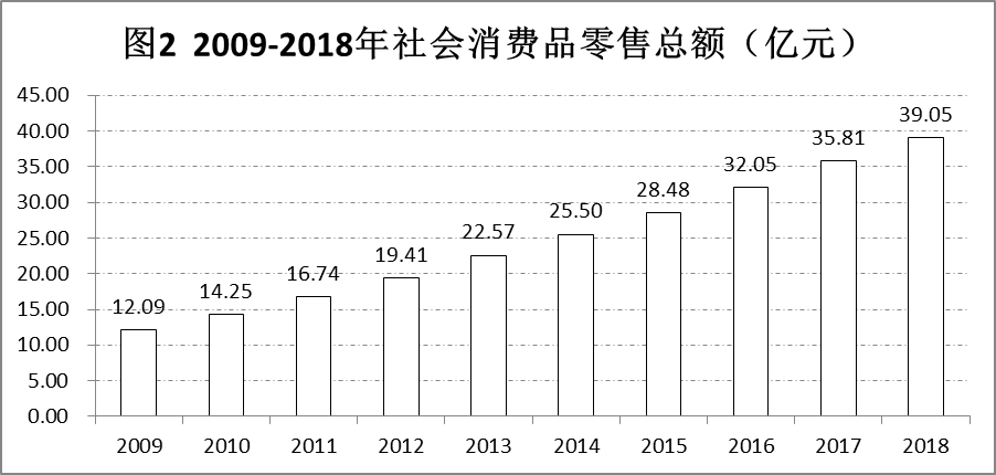 全年社會消費品零售總額39.05億元,比上年增長11.0%(見圖2),其中,縣城消費品零售額24.25億元,比上年增長13.5%,農村市場消費品零售額14.80億元,比上年增長7.1%。分行業看,批發零售貿易業零售額35.16億元,增長8.4%;住宿餐飲業零售額3.89億元,增長41.5%。