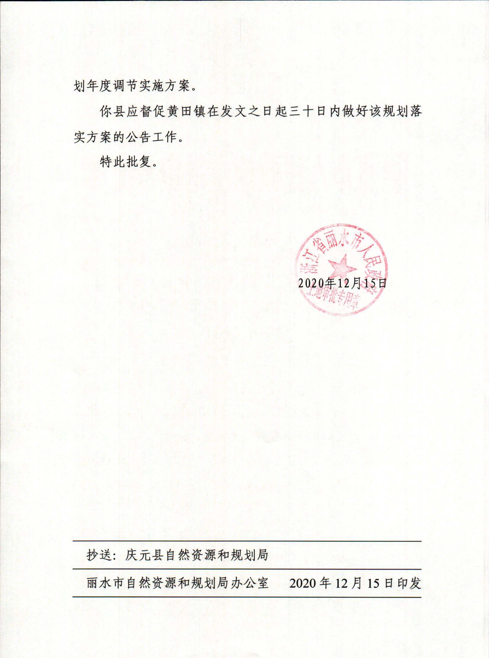 麗水市人民政府關于《慶元縣黃田鎮土地利用總體規劃(2006-2020年)》2020年度第2次調節實施方案的批復