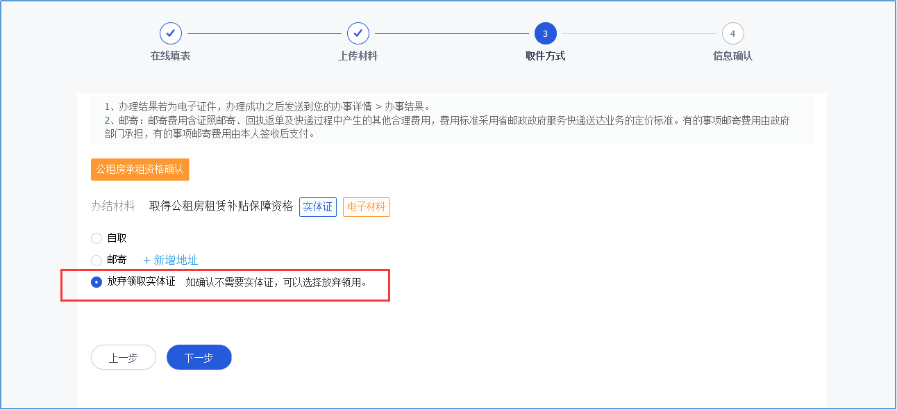 第11步:“取件方式”。選擇“放棄領(lǐng)取實(shí)體證”