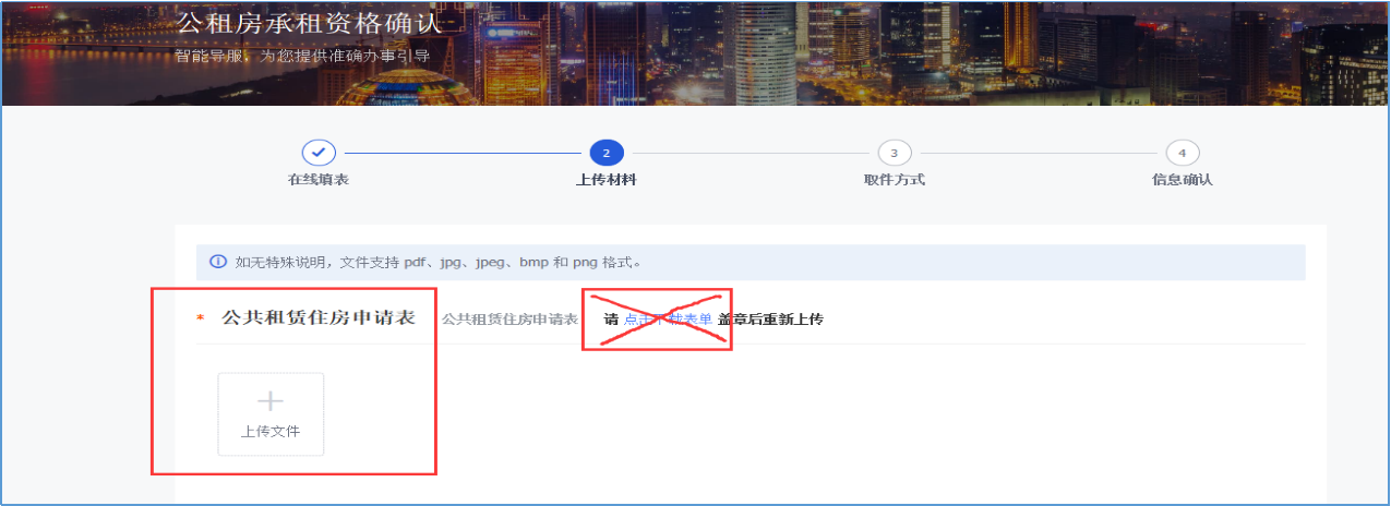 第10步:“上傳材料”。根據(jù)列表要求上傳材料,帶“*”號(hào)材料為必傳材料。其中《公共租賃住房申請(qǐng)表》請(qǐng)上傳附件3《慶元縣公共租賃住房申請(qǐng)表(新就業(yè)、外來(lái)務(wù)工)》,不要點(diǎn)擊“點(diǎn)擊下載表單”。