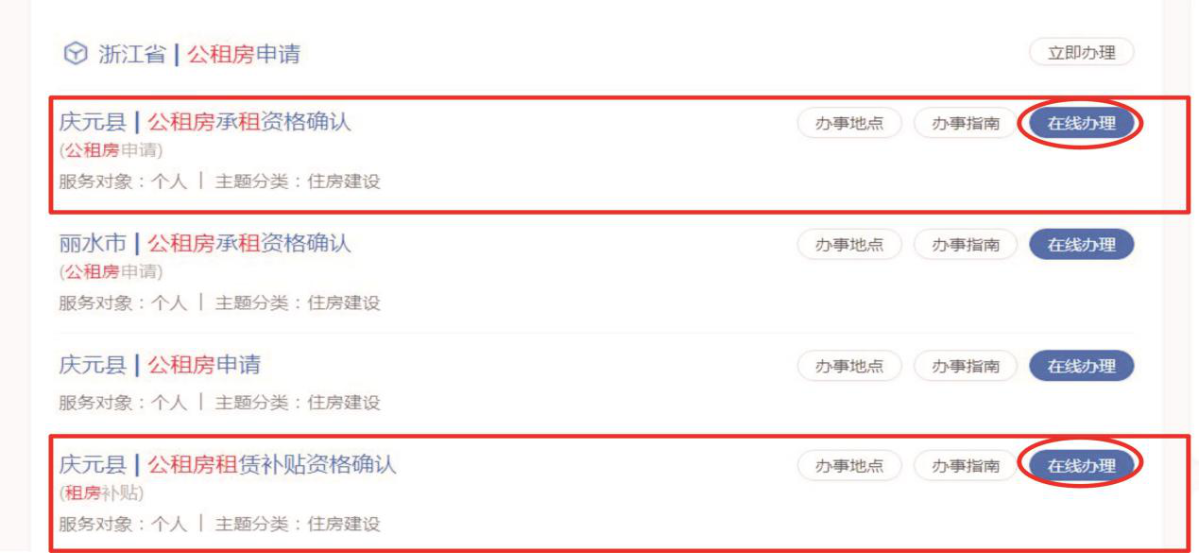 第4步:找到“慶元縣│公租房租賃補(bǔ)貼資格確認(rèn)”,或者“慶元縣公租房承租資格確認(rèn)”,點(diǎn)擊對(duì)應(yīng)的“在線辦理”。