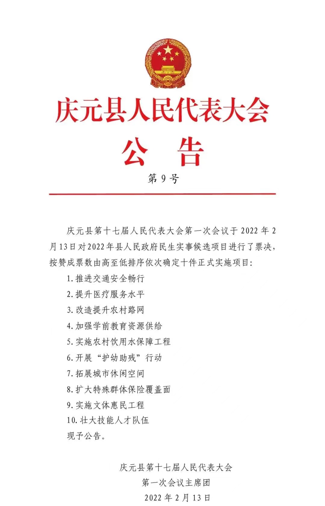 慶元縣第十七屆人民代表大會第一次會議關于2022年民生實事候選項目票決公告