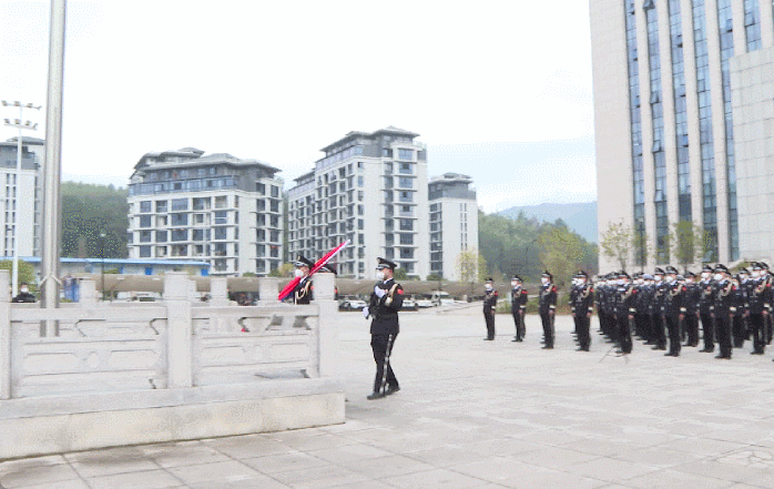 儀式現場,全體民警精神抖擻、整齊列隊。上午9時,伴隨著指揮員嘹亮的口令,護旗手護衛著中國人民警察警旗,邁著鏗鏘有力的步伐走向升旗臺。在雄壯激昂、催人奮進的《中國人民警察警歌》中,升旗手揮臂展旗,警旗冉冉升起。全體民警莊嚴敬禮,共同祝愿偉大祖國繁榮昌盛、人民幸福安康。
