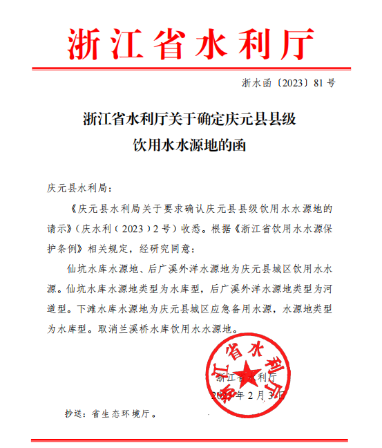 關于確定慶元縣縣級飲用水水源地的函