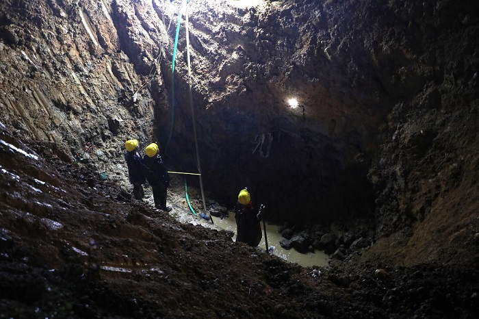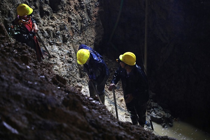 搶修現場,搶修人員通過專業勘探,準確找到了地下管道破損的具體位置,在摸清管道基本情況后,制定了緊急搶修方案,第一時間關閉相關閥門止水,利用挖掘機對爆管上方土石進行挖除。由于降雨影響,施工坑洞距地面有12米深,坑底黑暗潮濕,不時還有土石塊落下,搶修人員在坑洞內抽排積水、清理管道周邊污泥。