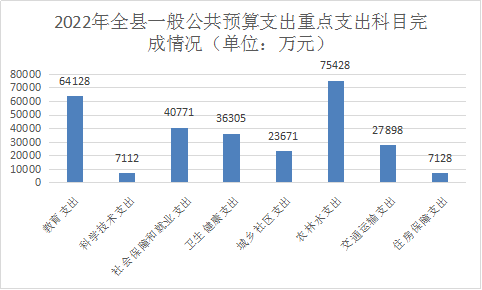 2022年,縣本級一般公共預(yù)算支出42.29億元,完成預(yù)算的100.1%,增長9.8%,加上轉(zhuǎn)移性支出(預(yù)計)5.15億元,其中:上解上級支出1.53億元、援助其他地區(qū)支出820萬元、結(jié)轉(zhuǎn)下年支出3.54億元,支出合計47.44億元。