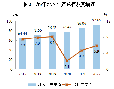 初步核算,2022年全縣生產總值(GDP)92.65億元,按可比價格計算,比上年增長5.9%。其中,第一產業增加值8.13億元,第二產業增加值31.94億元,第三產業增加值52.58億元,分別增長4.1%、5.8%和6.2%。一季度、上半年、前三季度全縣生產總值同比分別增長5.5%、4.1%和5.7%。人均地區生產總值為65019元(按年平均匯率折算為9667美元),增長6.2%。