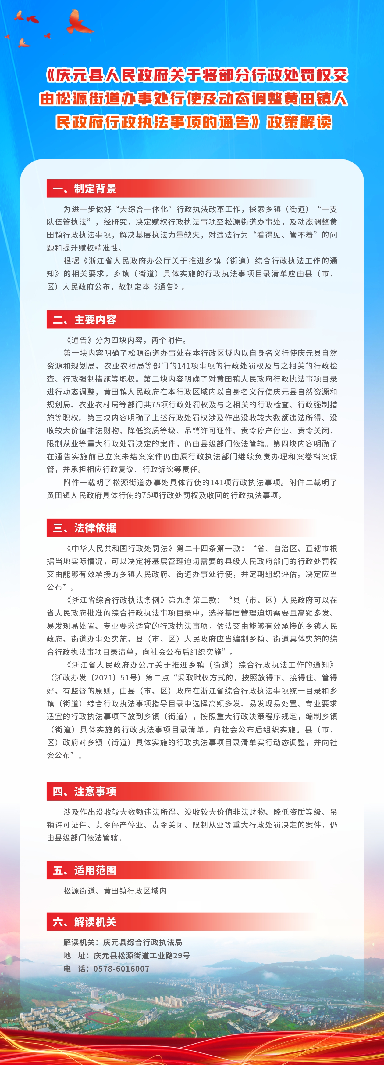 第一塊內容明確了松源街道辦事處在本行政區域內以自身名義行使慶元縣自然資源和規劃局、農業農村局等部門的141項事項的行政處罰權及與之相關的行政檢查、行政強制措施等職權。第二塊內容明確了對黃田鎮人民政府行政執法事項目錄進行動態調整,黃田鎮人民政府在本行政區域內以自身名義行使慶元縣自然資源和規劃局、農業農村局等部門共75項行政處罰權及與之相關的行政檢查、行政強制措施等職權。第三塊內容明確了上述行政處罰權涉及作出沒收較大數額違法所得、沒收較大價值非法財物、降低資質等級、吊銷許可證件、責令停產停業、責令關閉、限制從業等重大行政處罰決定的案件,仍由縣級部門依法管轄。第四塊內容明確了在通告實施前已立案未結案案件仍由原行政執法部門繼續負責辦理和案卷檔案保管,并承擔相應行政復議、行政訴訟等責任。