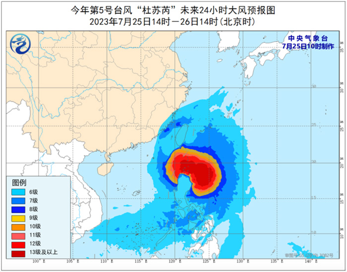 今年第5號超強臺風“杜蘇芮”逐漸向臺灣島南部沿海靠近,7月27日將移入南海東北部,然后向福建中部到廣東東部一帶沿海靠近。近中心最大風力17級以上,七級風圈半徑300—450公里,十級風圈半徑120—180公里,十二級風圈半徑90—120公里。