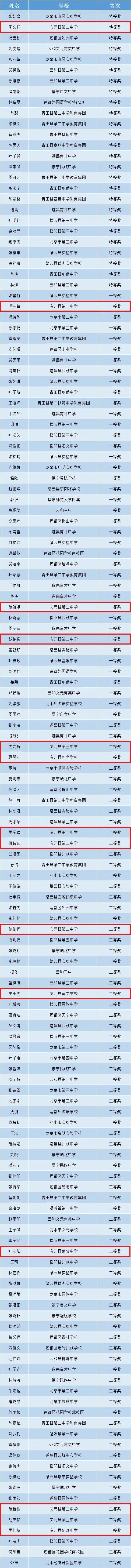 經過激烈角逐,慶元縣榮獲特等獎1個,一等獎3個,二等獎10個,優秀指導教師獎2個,此外,還獲得縣級團體三等獎,一起來看獲獎名單!