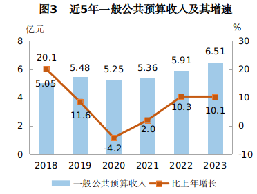 全年財政總收入11.21億元,比上年增長31.0%;一般公共預算收入6.51億元,增長10.1%。其中,稅收收入5.12億元,增長43.9%,占一般公共預算收入的78.6%。一般公共預算支出47.33億元,增長11.9%。民生支出占財政支出的69.6%。