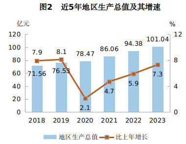初步核算,2023年全縣生產總值(GDP)[]101.04億元,按可比價格計算,比上年增長7.3%。其中,第一產業增加值8.35億元,第二產業增加值34.38億元,第三產業增加值58.31億元,分別增長5.2%、7.0%和7.9%。一季度、上半年、前三季度全縣生產總值同比分別增長5.4%、6.9%和7.6%。人均地區生產總值為71405元(按年平均匯率折算為10133美元),增長8.1%。