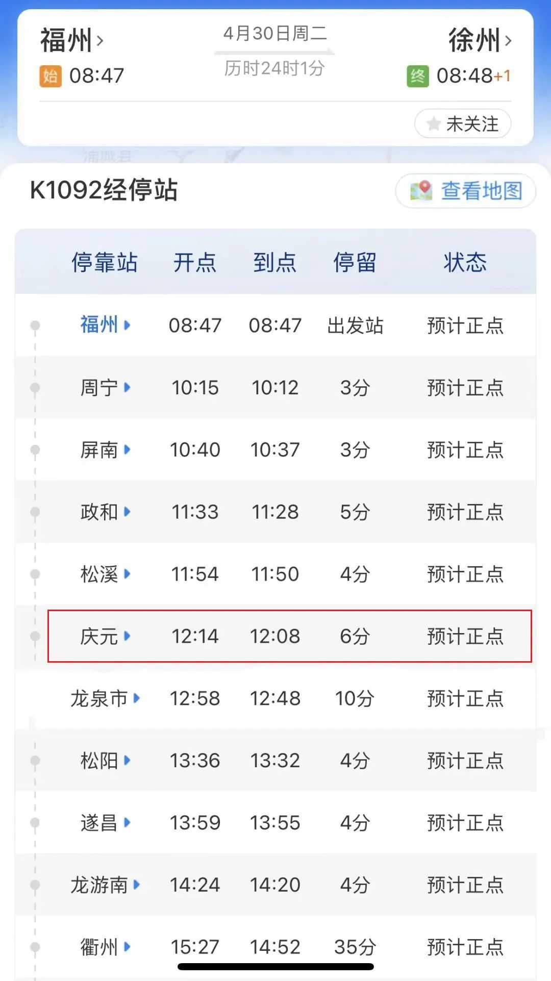 k1092次列車于8時47分從福州站出發(fā),經停23站,次日8時48分到徐州站,歷時24小時1分,每日12時08分到慶元站,停留6分鐘。