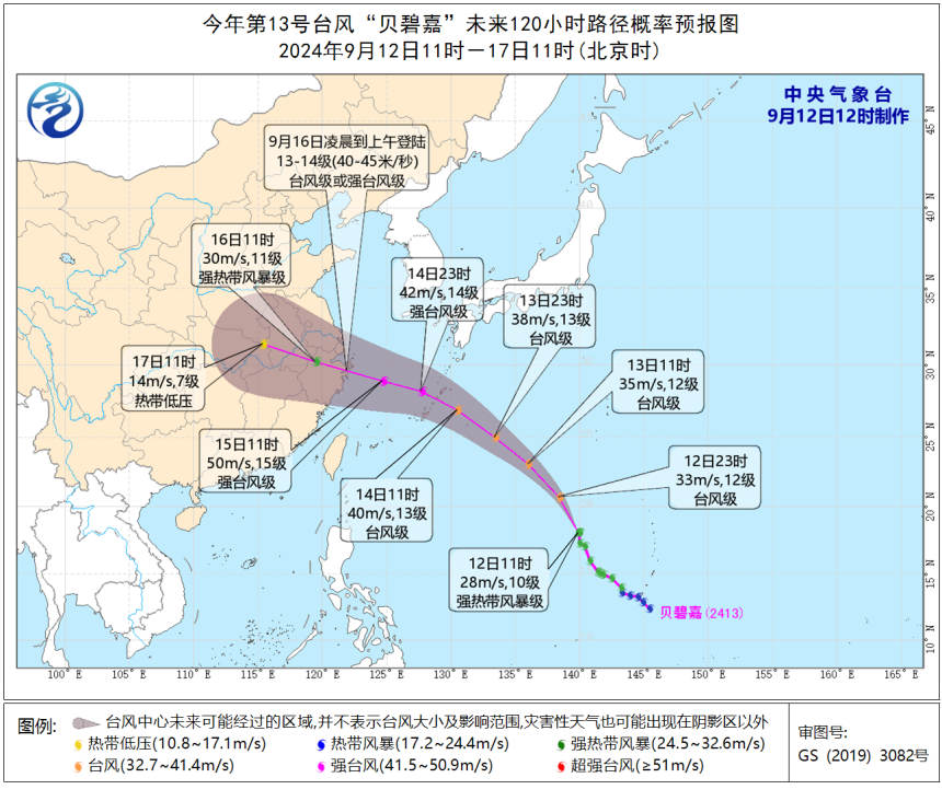 預計“貝碧嘉”將以每小時25公里左右的速度向西北方向移動,強度逐漸增強,14日夜間穿過琉球群島移入東海東部海面,之后向浙閩沿海靠近,并將于16日凌晨至上午在浙江到福建北部一帶沿海登陸(臺風級或強臺風級,13-14級,40-45 米/秒),之后強度逐漸減弱。