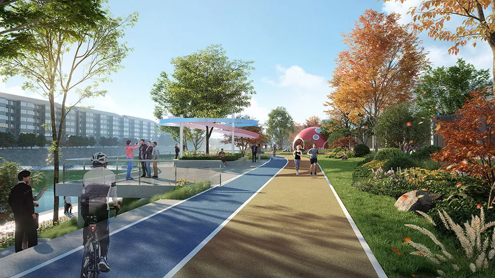 項(xiàng)目以“主客共享、老少皆宜”為目標(biāo),科學(xué)劃分三大功能區(qū):“超好玩”兒童戲水區(qū)。根據(jù)場(chǎng)地特色,因地制宜打造蜿蜒戲水道,串聯(lián)景觀水池、鏡面噴泉、霧森、趣味涌泉、水文化研學(xué)設(shè)施等節(jié)點(diǎn),設(shè)置兒童戲水、自然科普、研學(xué)教育等五大模塊,帶娃、休息兩不誤。“超健康”運(yùn)動(dòng)休閑區(qū)。依托岸坡地形改造攀巖墻、健身步道等設(shè)施,形成融合自然與運(yùn)動(dòng)的堤頂綠地公園。“超舒服”濱水休閑區(qū)。布局休憩座椅、遮陽廊架及文化展陳空間,營(yíng)造可駐足、可社交的慢生活場(chǎng)景。