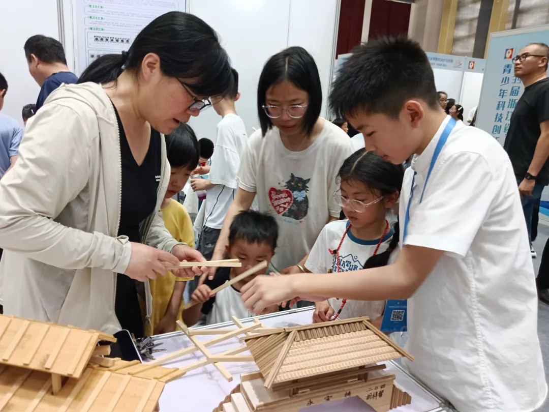 林子洋同學的作品為《探究廊橋千年不倒的秘密》。他通過反復搭建實驗模型、查閱文獻資料,揭示了廊橋“千年不倒”的核心原理:編梁木拱受壓形成的拱形結構、底座“八字形”對稱設計以及桁架節點的精密銜接。為進一步驗證理論,他在木棒上添加卡口模擬傳統榫卯結構,最終成功搭建出可承載一人重量的廊橋模型。答辯現場,他搭建廊橋模型,生動闡釋了傳統技藝與現代科學的融合,為文化遺產保護提供了創新思路。