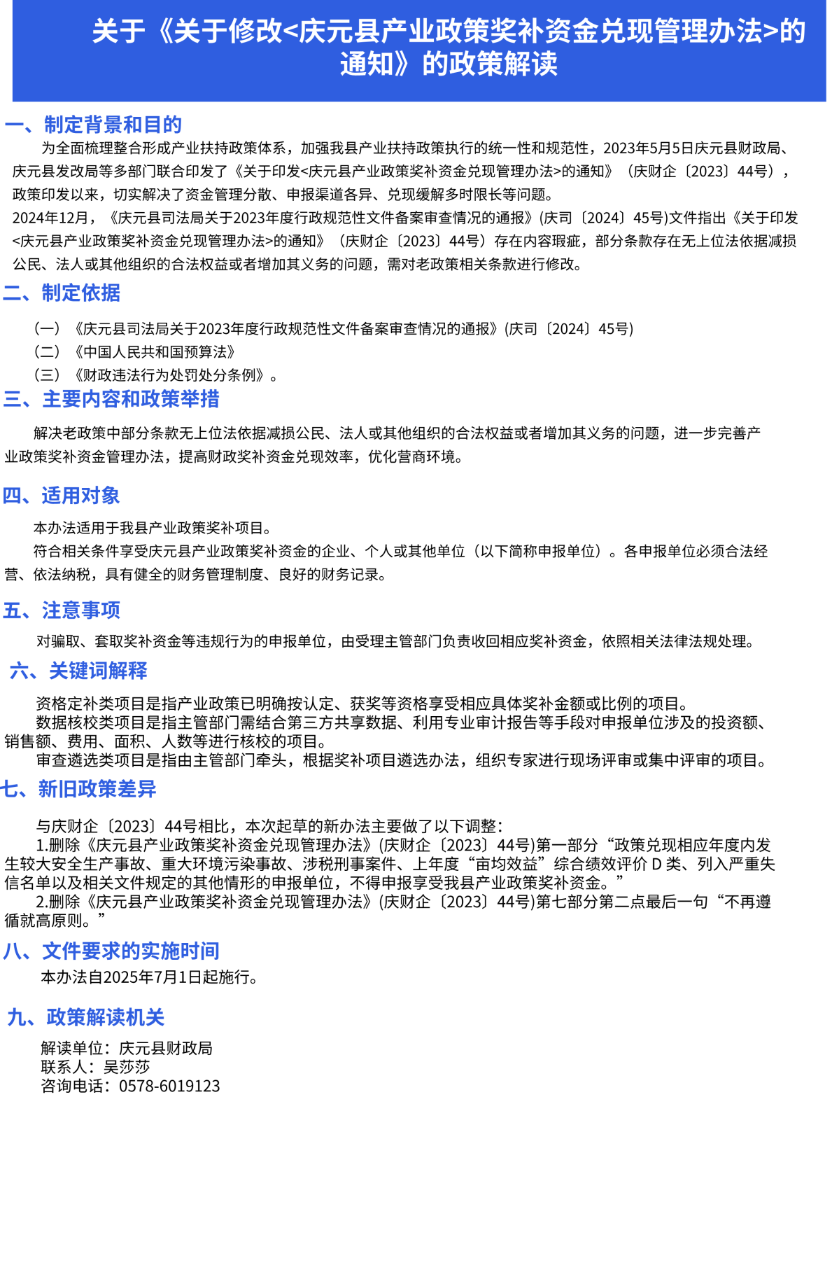 為全面梳理整合形成產業扶持政策體系,加強我縣產業扶持政策執行的統一性和規范性,2023年5月5日慶元縣財政局、慶元縣發改局等多部門聯合印發了《關于印發〈慶元縣產業政策獎補資金兌現管理辦法〉的通知》(慶財企〔2023〕44號),政策印發以來,切實解決了資金管理分散、申報渠道各異、兌現環節多時限長等問題。