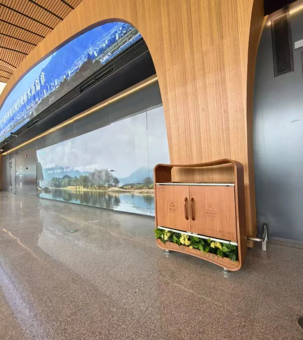 在候機大廳,造型獨特的曲竹垃圾桶格外醒目,棕褐色桶體以“騰飛機翼”為靈感,流暢線條與即將完成的拱門造型相呼應。