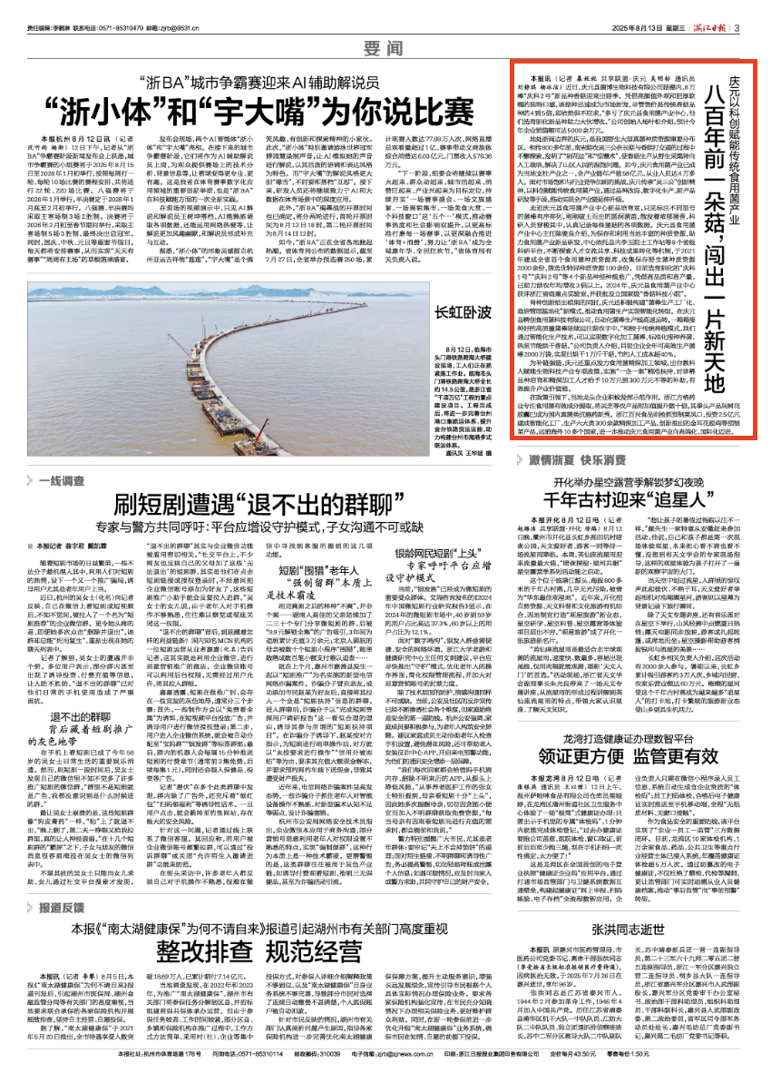 地處浙閩邊界的慶元,是我國(guó)野生大型真菌種質(zhì)資源重要分布區(qū)。相傳800多年前,南宋菇農(nóng)吳三公在長(zhǎng)期與香菇打交道的過(guò)程中不懈探索,發(fā)明了“剁花法”和“驚蕈術(shù)”,使香菇生產(chǎn)從野生采集轉(zhuǎn)向人工栽培,解決了山區(qū)人民的溫飽問(wèn)題。如今,慶元食用菌產(chǎn)業(yè)已成為當(dāng)?shù)刂еa(chǎn)業(yè)之一,全產(chǎn)業(yè)鏈年產(chǎn)值58億元,從業(yè)人員達(dá)4萬(wàn)多人。面對(duì)市場(chǎng)飽和與行業(yè)競(jìng)爭(zhēng)加劇的挑戰(zhàn),慶元傳承“吳三公”創(chuàng)新精神,以科創(chuàng)賦能傳統(tǒng)食用菌產(chǎn)業(yè),通過(guò)品種改良、數(shù)字化生產(chǎn)、新產(chǎn)品研發(fā)等手段,推動(dòng)實(shí)現(xiàn)全產(chǎn)業(yè)鏈延伸升級(jí)。