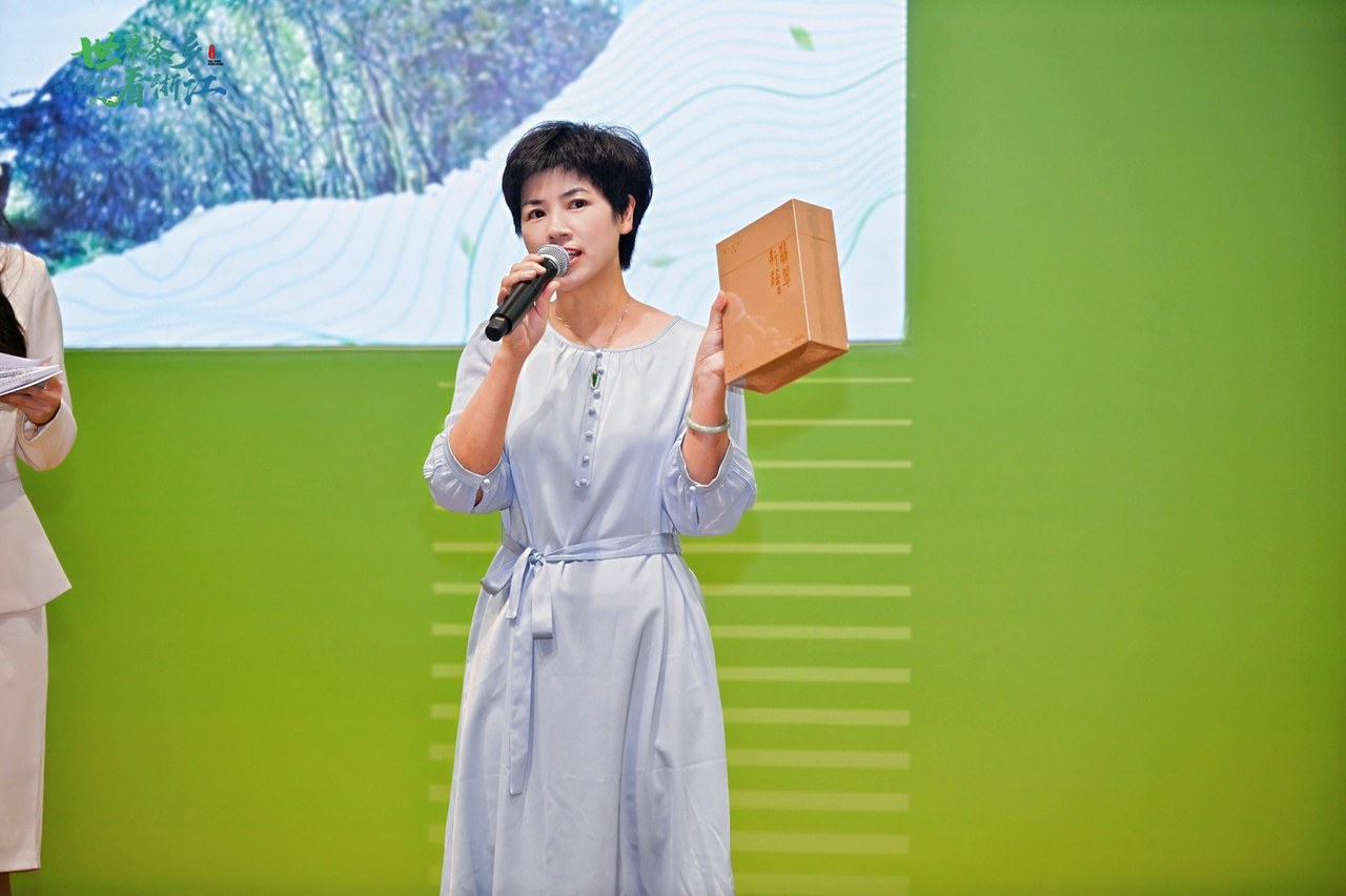 香港慶元同鄉(xiāng)會(huì)會(huì)長(zhǎng)葉真英對(duì)五大茶館聯(lián)動(dòng)審評(píng)慶元荒野茶情況進(jìn)行介紹