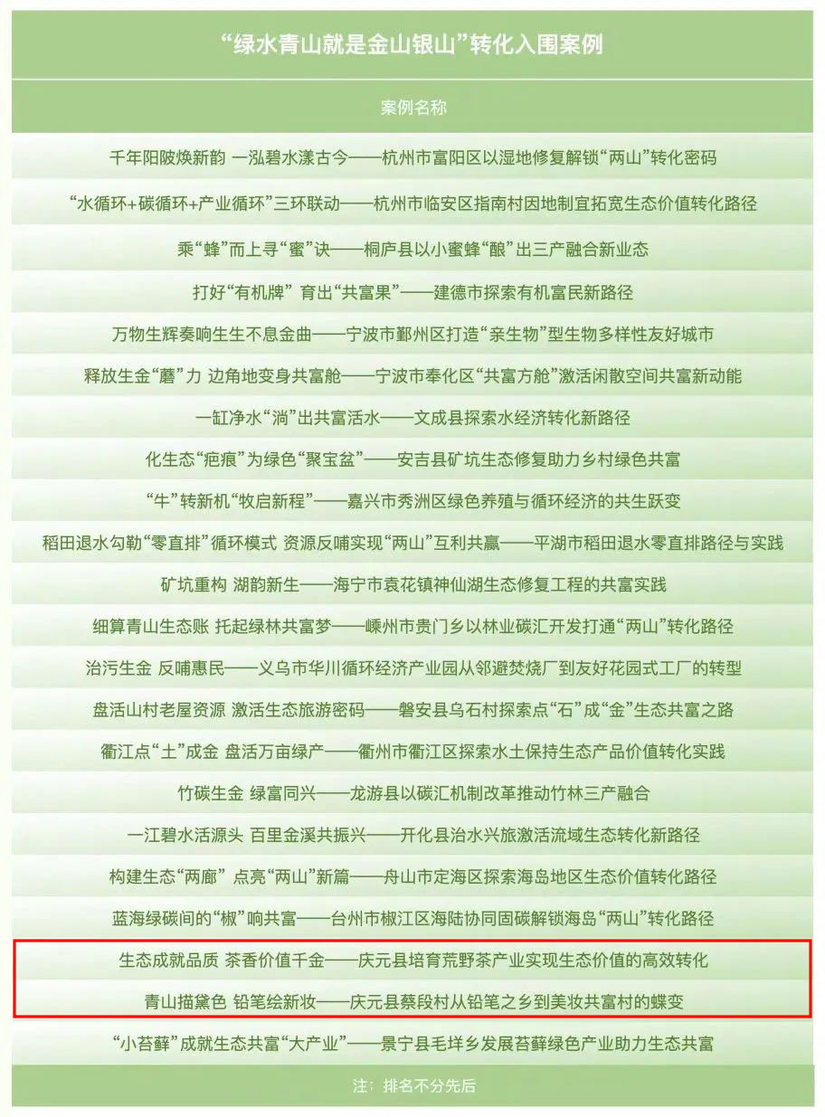 近日,省美麗浙江建設領導小組辦公室公布“綠水青山就是金山銀山”轉化典型案例和入圍案例。我縣《生態成就品質 茶香價值千金——慶元縣培育荒野茶產業實現生態價值的高效轉化》《青山描黛色 鉛筆繪新妝——慶元縣蔡段村從鉛筆之鄉到美妝共富村的蝶變》兩個案例成功入圍。
