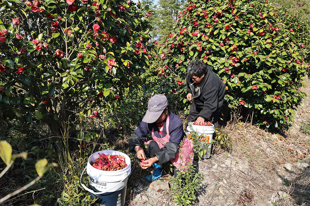 當前正值紅花油茶采花期,基地組織周邊留守群眾集中撿拾花瓣,每人每天工資可達150元左右。此次采花期持續(xù)一個多月,預計可帶動村民月均增收超過4000元。