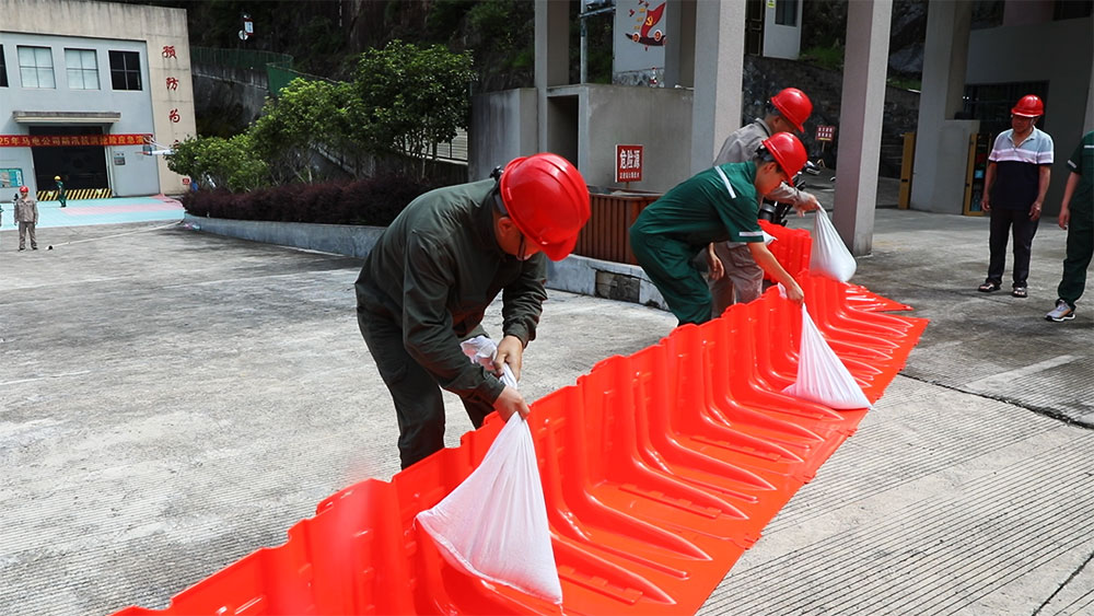 本次演練中,各搶險隊分工明確。馬電搶險隊第一分隊封堵二號廠房1~6號排水孔、涵洞口,裝設大門區塊排水泵,填裝沙袋預防二號廠房進水;馬電搶險隊第二分隊裝設升壓站區塊排水泵,安裝擋水板。